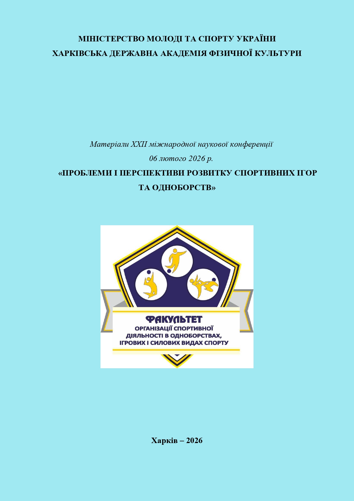 Том 1 (2025)У збірнику представлені статті з проблем організації навчально-тренувального процесу в закладах вищої освіти, ДЮСШ; вдосконалення підготовки спортсменів в сучасних умовах; стану фізичної, техніко-тактичної та психологічної підготовленості спортсменів; ефективності змагальних показників; організації патріотичного виховання молоді України в процесі занять єдиноборствами та спортивними іграми; вдосконалення процесу фізичного виховання студентів з використанням єдиноборств та спортивних ігор.