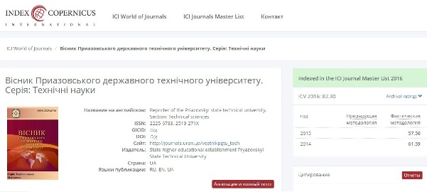 Index Copernicus Value 2016 of the journal "Reporter of the Priazovskyi State Technical University. Section: Technical sciences" is 82.3!